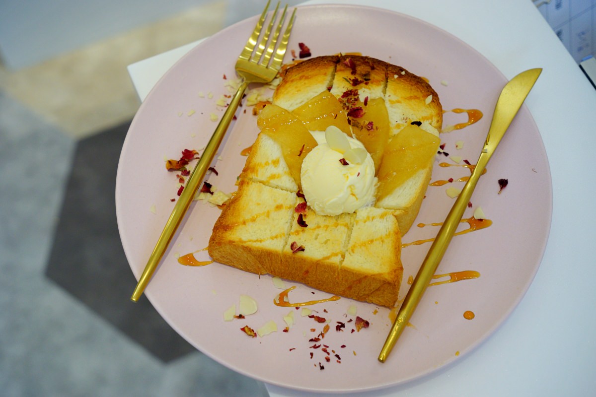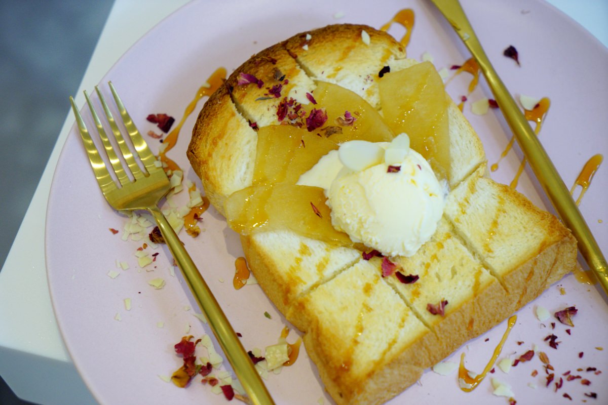 冰淇淋因為放在烤過的吐司上,建議盡快食用,因為冰淇淋會融化~