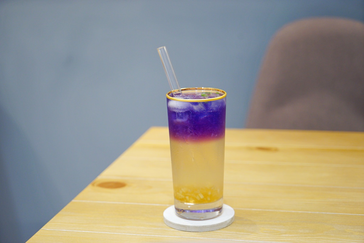 使用蝶豆花製造漸層的氣泡飲品,加入自製蜜蘋果,吃到的蘋果顆粒,香甜不膩口,最後放上幾片薄荷葉,增添香氣。是一款清爽的氣泡飲料,適合即將到來的炎夏。