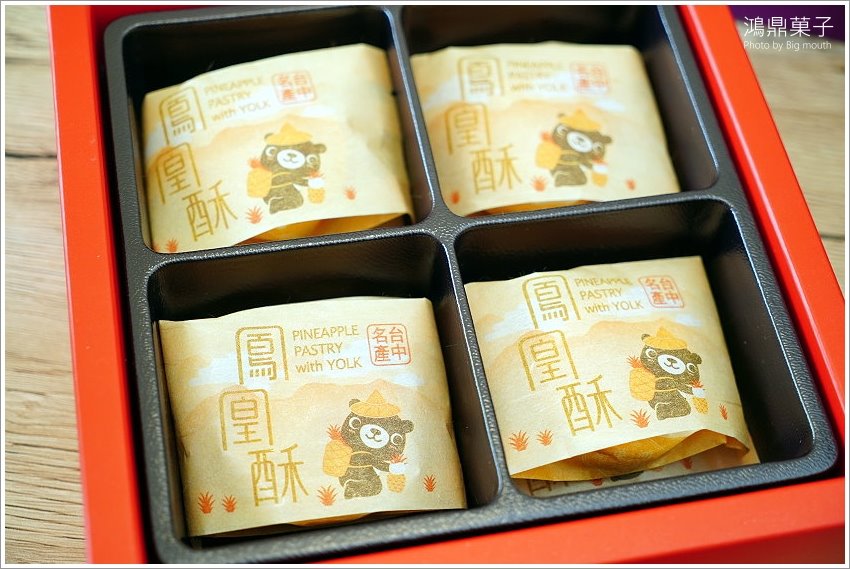 ▼「鴻鼎菓子」繼曲奇餅、堅果塔之後,又推出鳳凰酥,外盒採用可愛的台灣黑熊搭配採收鳳梨的意象,象徵是用產地的鳳梨來製成新鮮美味的鳳凰酥!