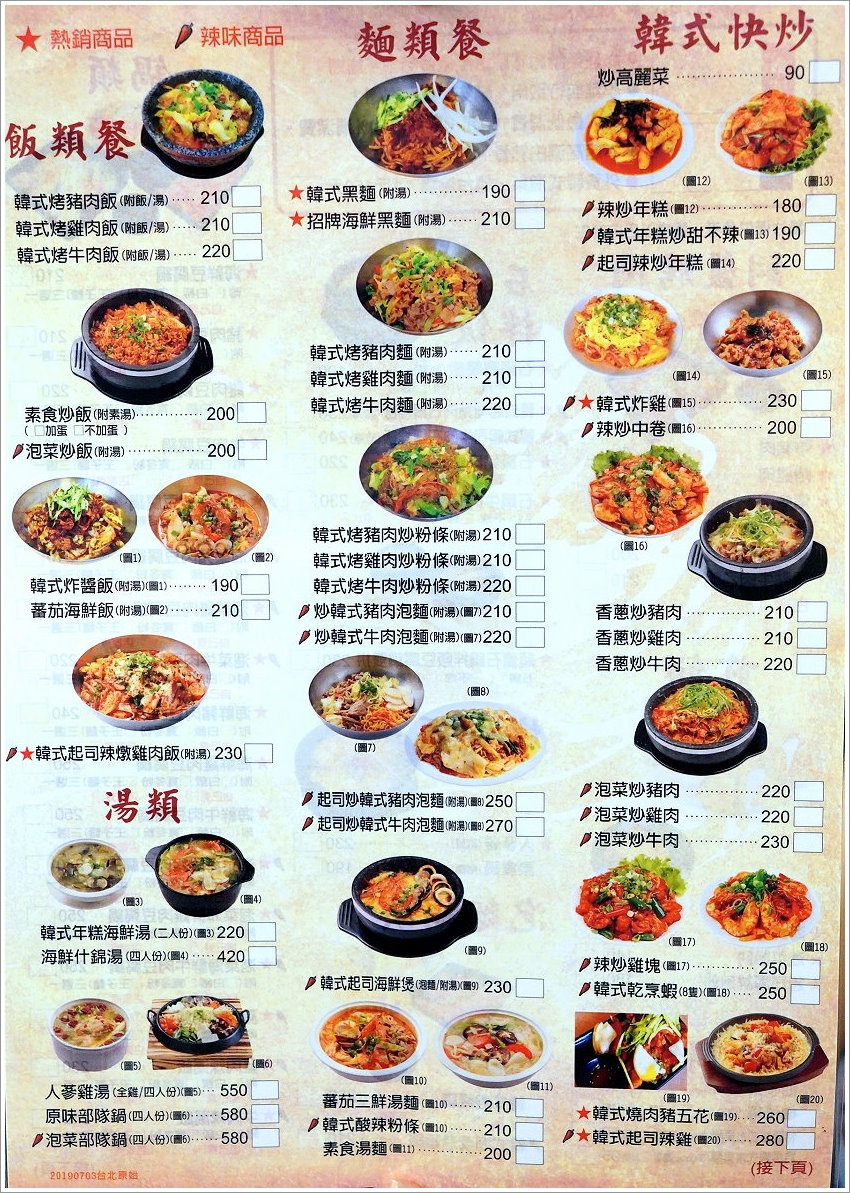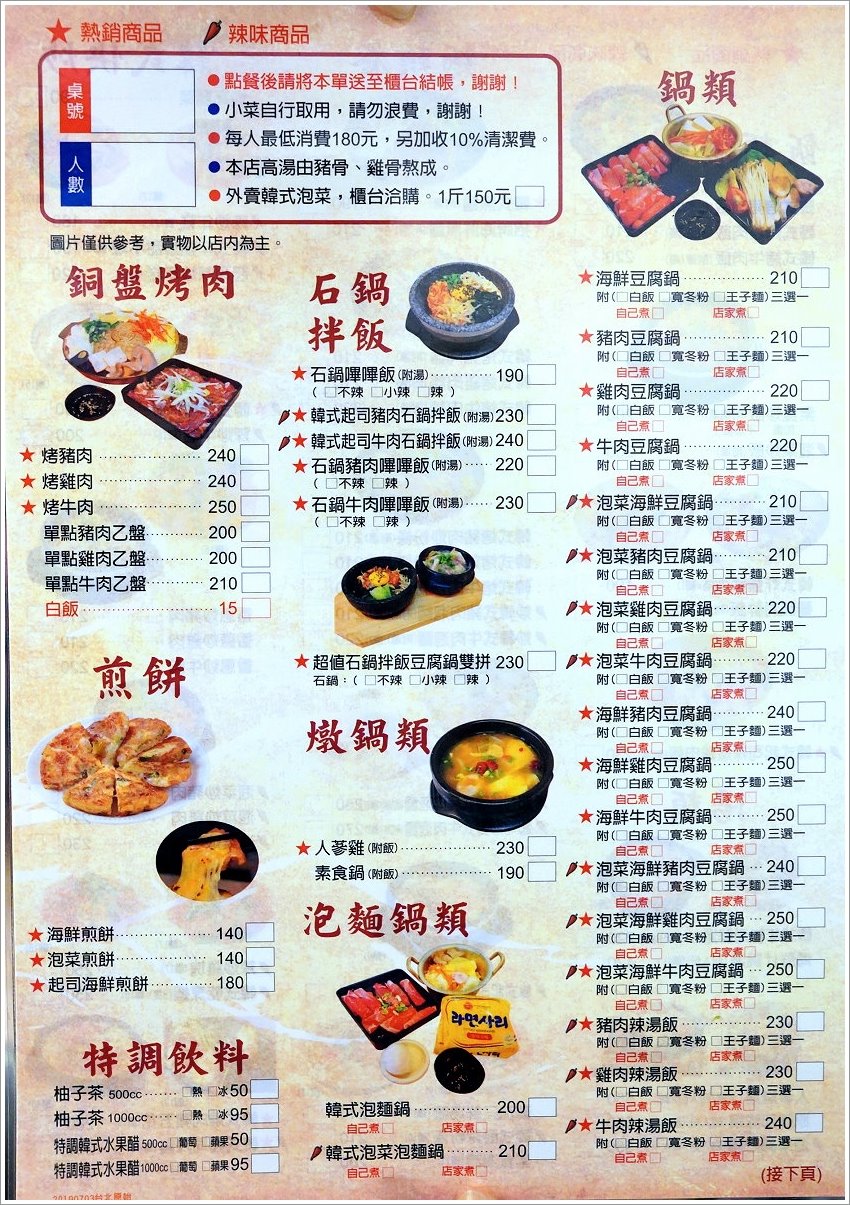 ▼菜單,這裡的餐點品項非常多元,每人低消為180元,另收一成服務費!前方有星號的是熱銷餐點,有辣椒符號的代表有辣度,大家可以參考點餐!