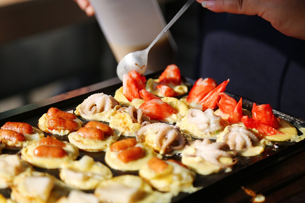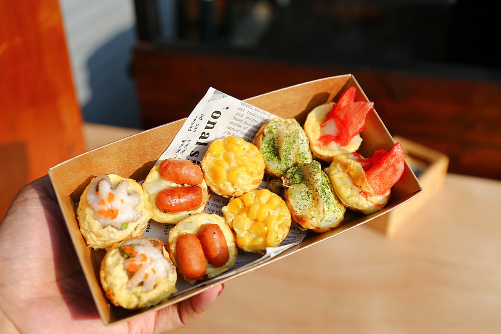 口感如玉子燒軟嫩,搭配多樣化的創意內餡,讓簡單的丸燒變得更不簡單了,食材會因為季節而改變,像是小章魚丸燒、玉米丸燒、肉豆丸燒等創意口味,特別引人注意,連小朋友也瘋狂,當下看著丸燒一層一層的翻烤、不斷重複的加入著蛋汁、在不斷的翻烤,光是在旁邊看就非常療癒。