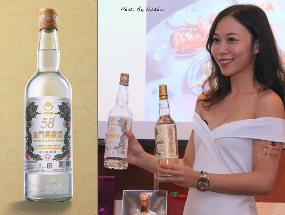 酒女郎右手手上拿的分別是是58度金門高粱酒與特級高粱酒,58度金門高粱問世以來將近六十年,幾乎是金門酒廠創廠酒款,是代表性的金門高粱酒,也因為賣太好,備受不法之徒覬覦,因此這兩種酒品採用獨家防偽技術,金門酒廠列出辨識十要訣,教消費者辨識假酒。