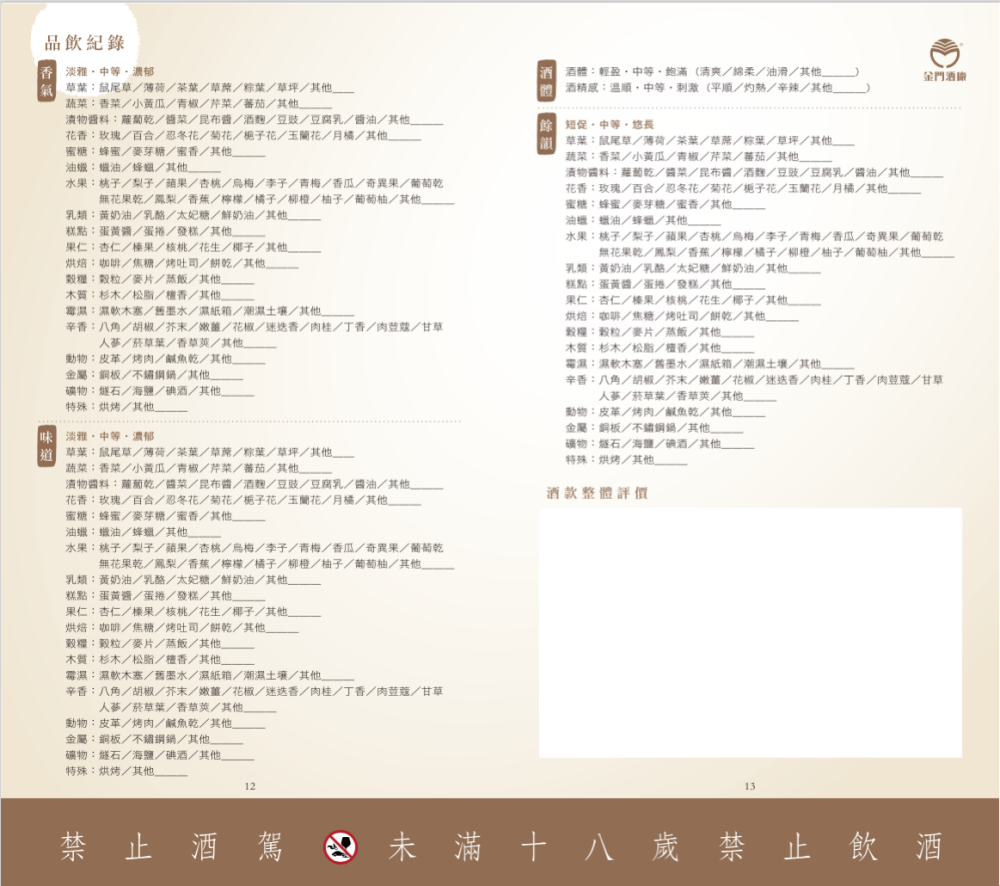 在品酒手冊的品飲紀錄中,列出香氣、味道、酒體、餘韻等項目,但由於每個人舌感、味覺、到對於整體口味感受度都不同,因此沒有標準答案,品酒著重在於各感官的感知,是一種享受樂趣的過程。