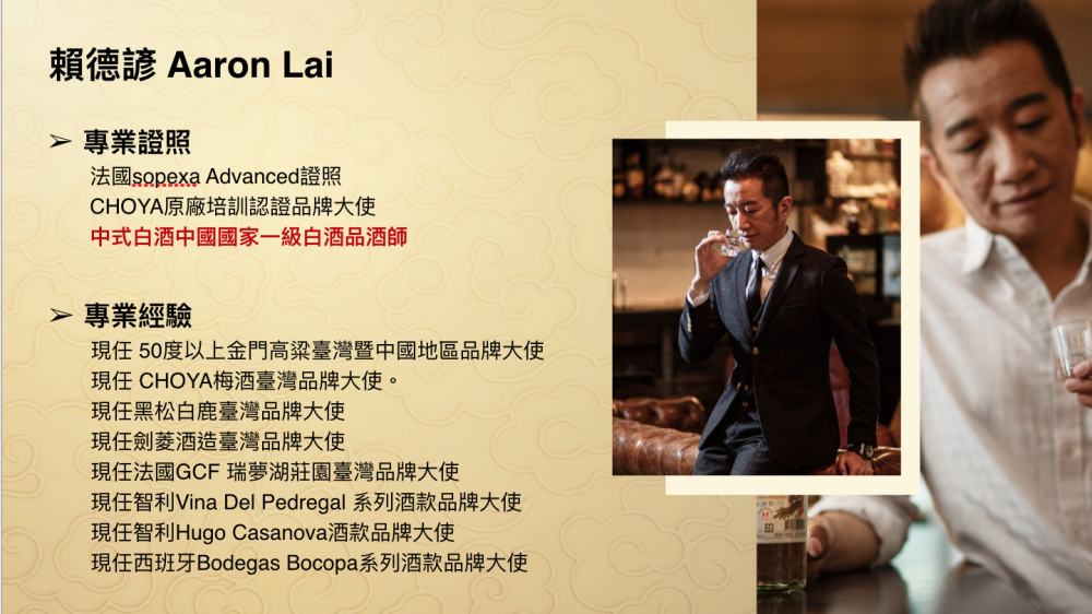 品酒會邀請擔任50度以上金門高粱台灣暨中國品牌大使-賴德諺老師逐一為來賓介金門風土歷史、金門酒廠沿革、四種酒款,以及品酒要訣。