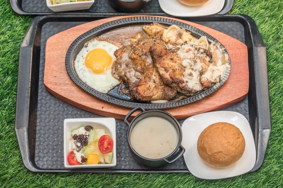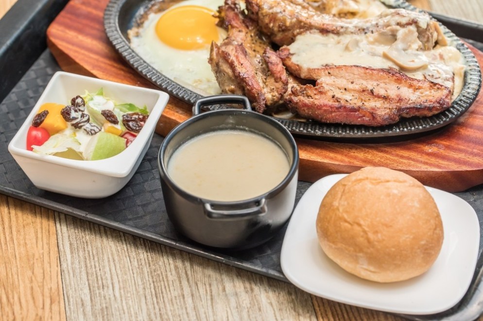而套餐裡面除了兩個主菜,也都有包括湯品沙拉跟餐包各兩份,如果要單點的朋友也沒有問題,單點價位之外加上49元就是湯跟餐包,69元的話就是通通有。