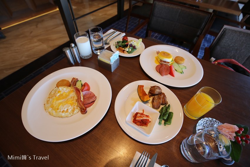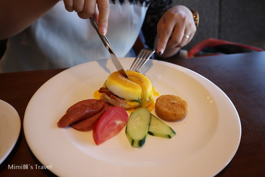 首爾皇家酒店的餐廳位於最高樓層,好像是21還是幾樓有點忘了,裝潢同樣也是很氣派,而且環境與採光都很棒,我喜歡這樣的用餐空間,尤其是窗邊的位置,看著低下往來的人與車,刷刷手機,氣氛挺舒服的。服務人員帶位之後會讓客人選擇一份類似主餐的料理,我點了一份班尼迪克蛋。