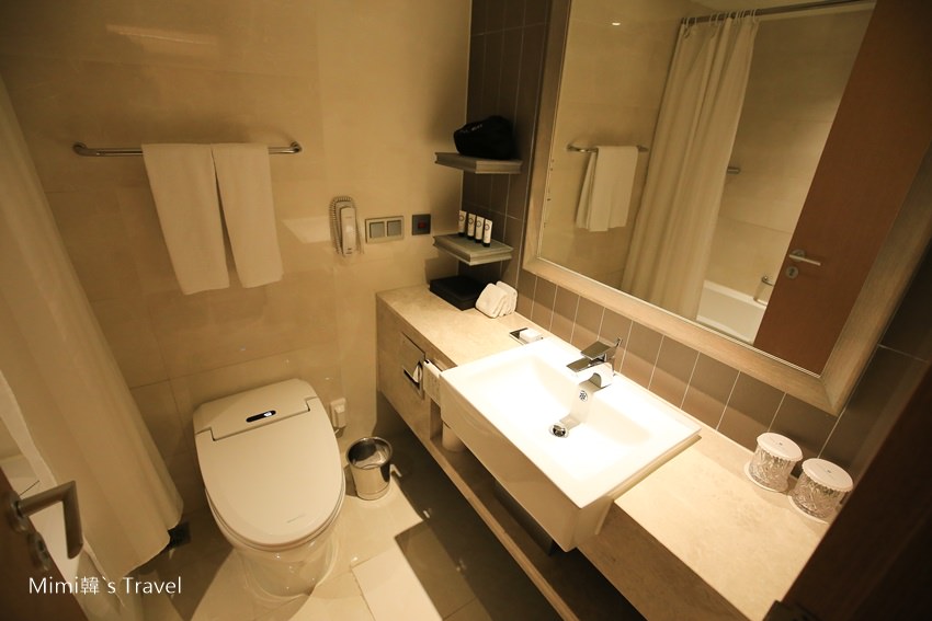 浴室空間還滿大,有浴缸、免治馬桶、洗澡的時候記得用浴簾隔開,才不會把地板弄得溼答答。