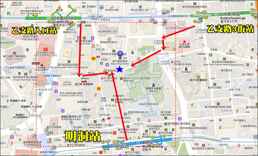 簡單看看地圖,藍色星星就是首爾皇家酒店(Royal Hotel Seoul),不管從乙支路入口站、明洞站過來都很方便,明洞站6號出口還有仁川機場巴士6001、6015的站牌,紅色的框框整區都是明洞很熱鬧的逛街地點,從飯店往左邊直走就能一路逛到樂天百貨、樂天免稅店去,我覺得是明洞很棒的住宿地點。