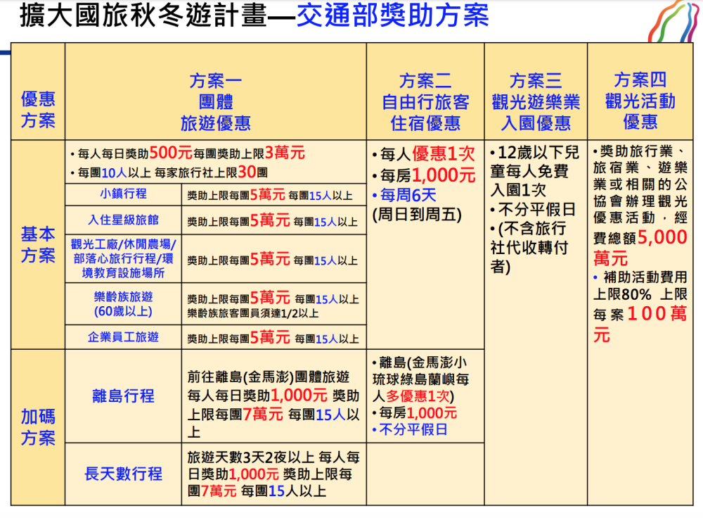 交通部觀光局網站已放上補助懶人包說明,安排交通住宿之前,先按照自身的旅遊型式查看是用哪一種補助。
