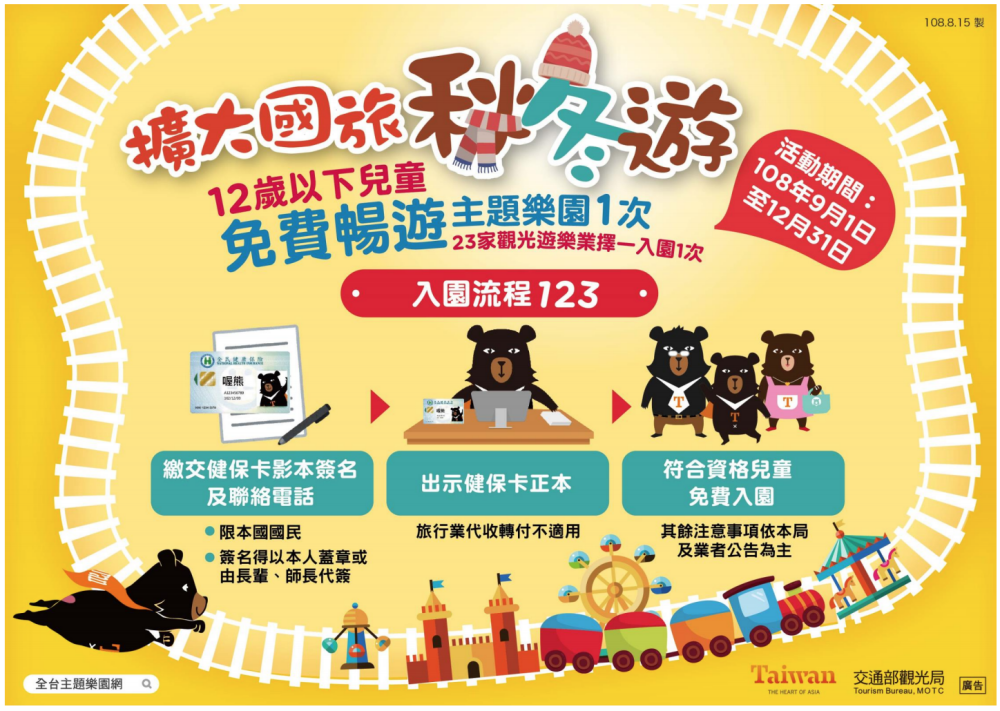 1.12 歲以下兒童可選擇一家觀光遊樂業業者享有免費 入園 1 次(不含旅行社代收轉付者)。