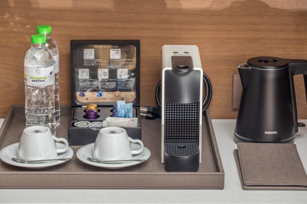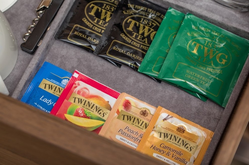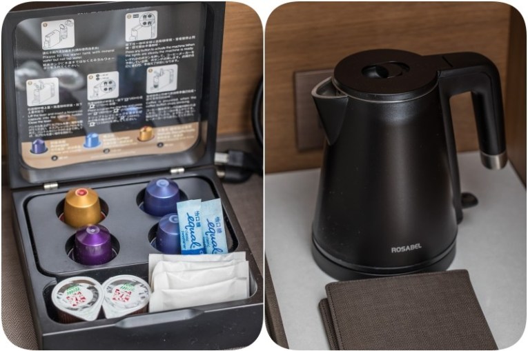 很有設計感的黑色熱水壺,搭配咖啡機與唐寧茶,雖然這已經是大部分高級飯店套房的標配,但台北中山逸林酒店也是一點都沒有忽略。