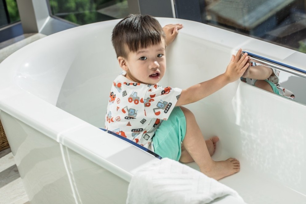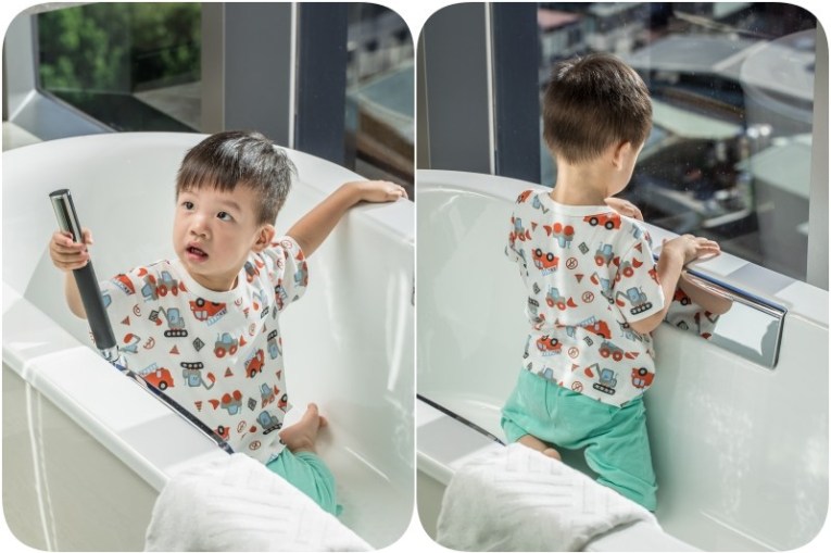 再來,就是一連串的溫溫浴缸照,在窗邊有著超棒的景色,溫溫一進去浴缸玩之後就不願意出來了。