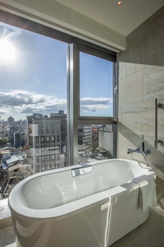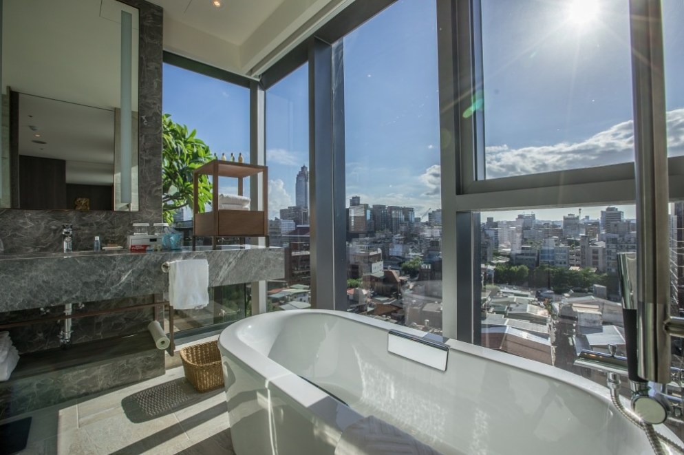 再往內走,就是林隅套房的最大亮點之一,也就是有著大型落地窗景的頂級衛浴空間。