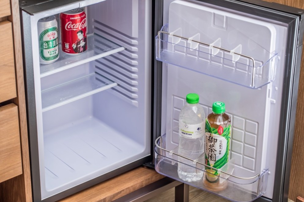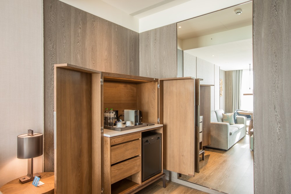 接下來,熊先帶著大家到這次我們一家三口入住的林隅套房,一進門口就有一個大型的木質櫥櫃,裡面滿滿的都是很重要的生活用品,包括熊很熱愛的咖啡機,還有飲用水與茶包,再加上可以自取的免費飲料。