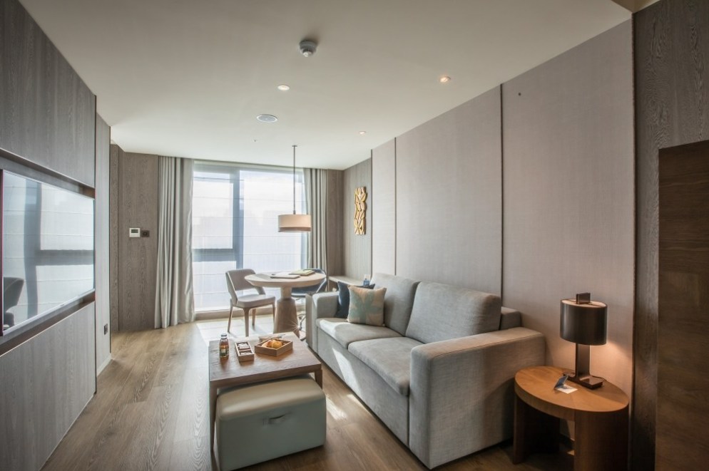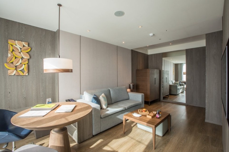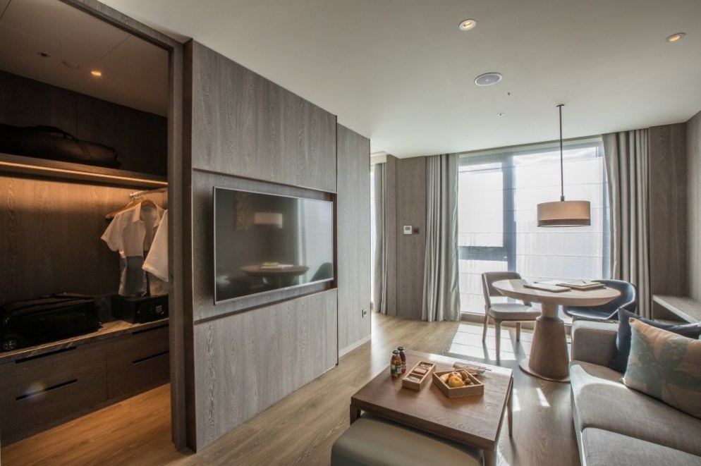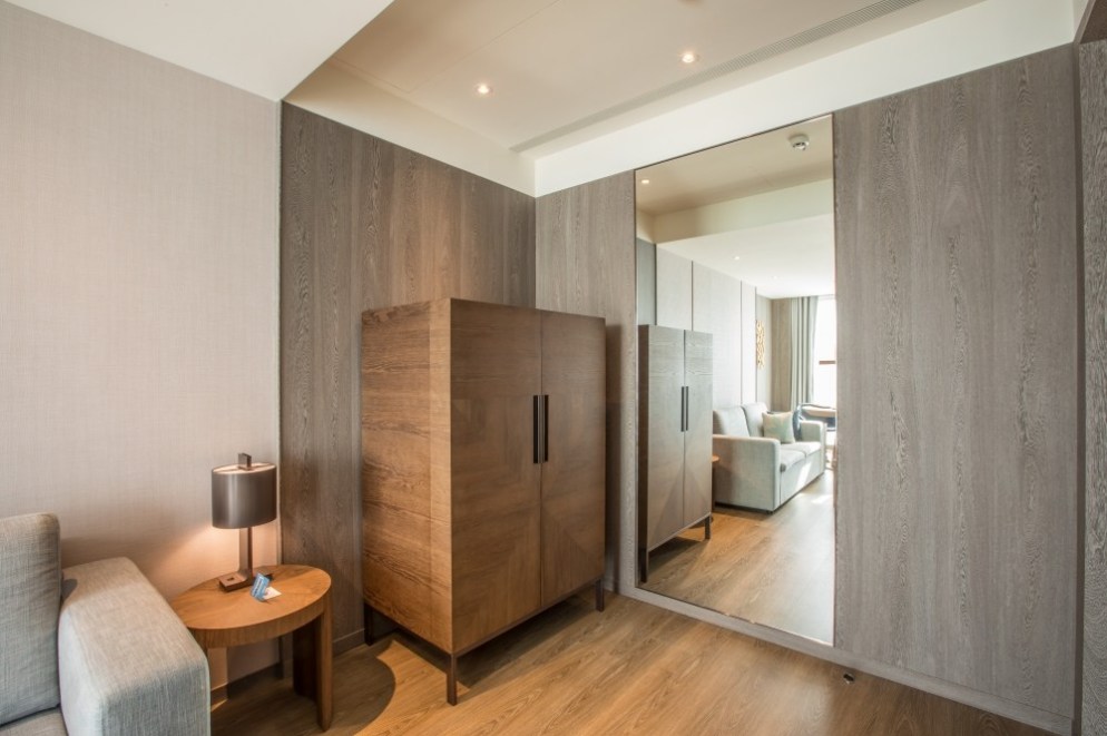 然後往另一邊看,就是林隅套房的起居空間,因為配置的關係,所以這個套房並沒有配置客人使用的洗手間,而更衣室與衣帽間也在門口的起居空間裡面,除了這兩個狀態比較不同之外,其他的細節都屬於標準邏輯。