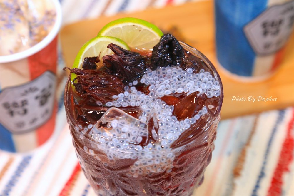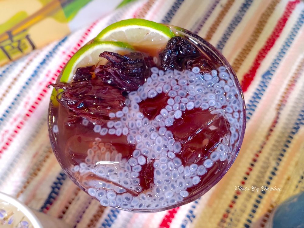 原料有雲南產乾燥洛神花、羅勒籽、檸檬片。本身已經有加入砂糖熬煮,不受理甜度調整。茶水光亮豔麗,清熱解喝,酸後回甜,以檸檬提香,雖然微酸但不嗆喉嚨,羅勒籽凝膠狀口感增添品飲趣味,還更有飽足感。
