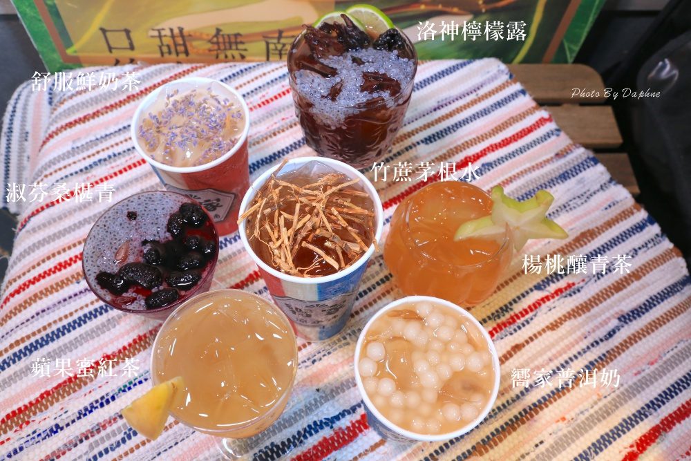 品嚐各系列共七種口味茶飲,有洛神檸檬露、舒服鮮奶茶、淑芬桑椹青、竹蔗茅根水、楊桃釀青茶、蘋果蜜紅茶、嚮家普洱奶。部分口味為了讓各位看得更清楚內容物食材,使用透明杯裝。