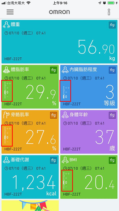 上面都會有清楚的骨骼肌率、體脂肪率、體重、身體年齡、內臟脂肪等級、基礎代謝、BMI