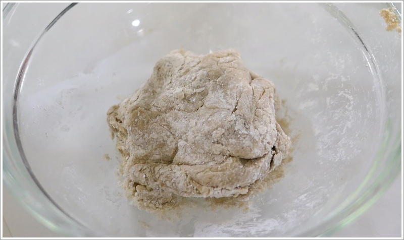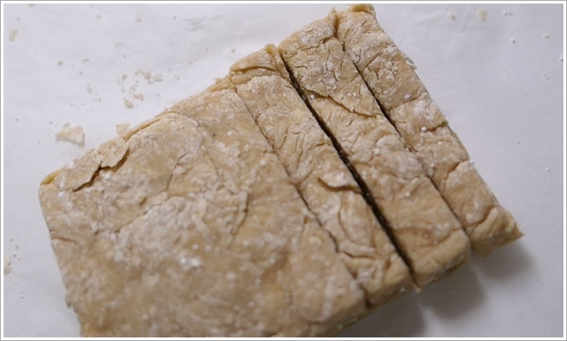 待麵團稍微冷卻,繼續用手將麵團揉搓成一團後壓平,厚度要少於1公分