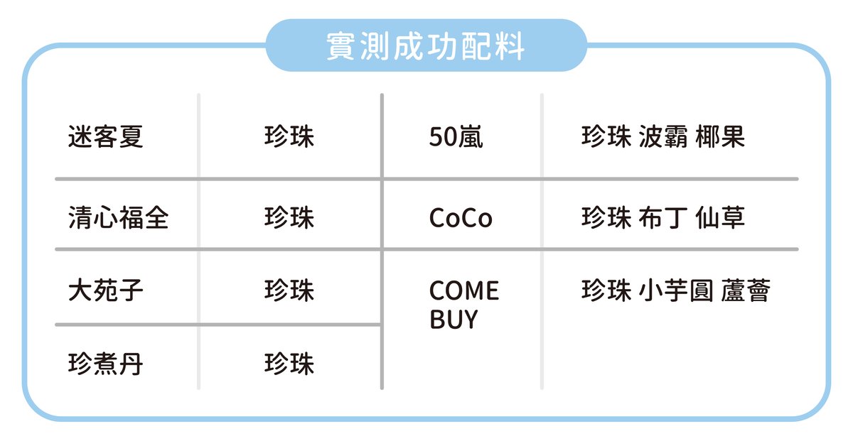 根據開發者實測,以下手搖品牌配料皆適合使用。