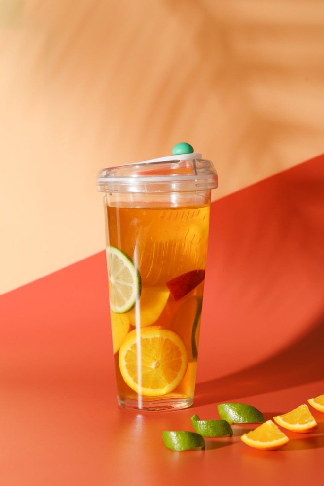 內部杯除了盛裝配料,當飲用水果茶時則可將調味用的水果阻隔在內杯以下,除了不會堵住杯口影響飲用,也讓每一口茶都經過水果的提味才到達口中。