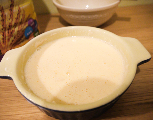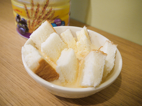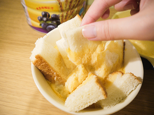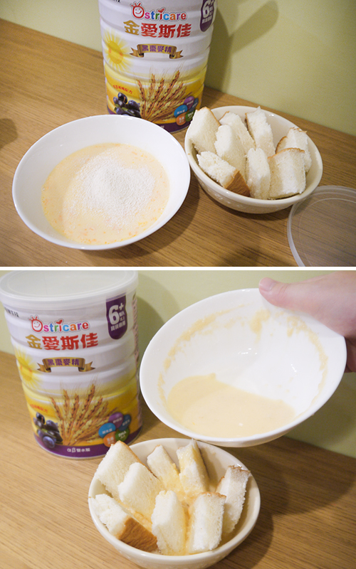 我看有人會將吐司整個浸泡在布丁液中,不過想說可以讓寶寶自己拿吐司吃,如果整個都浸泡怕會太軟不好拿。