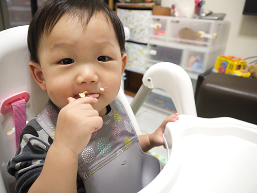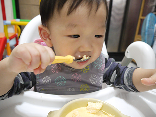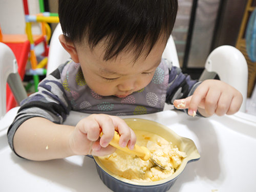 現在已經到了不喜歡別人餵的年紀了,別人餵都不吃一定要自己吃,雖然每次吃完餐盤和餐桌都跟戰場一樣,不過學習吃飯還是很重要,因為一餐兩個點心太多了,所以蒸蛋吃了一半後就改給他吃麥精吐司布丁,剩下的副食品就由我和他媽媽來解決。
