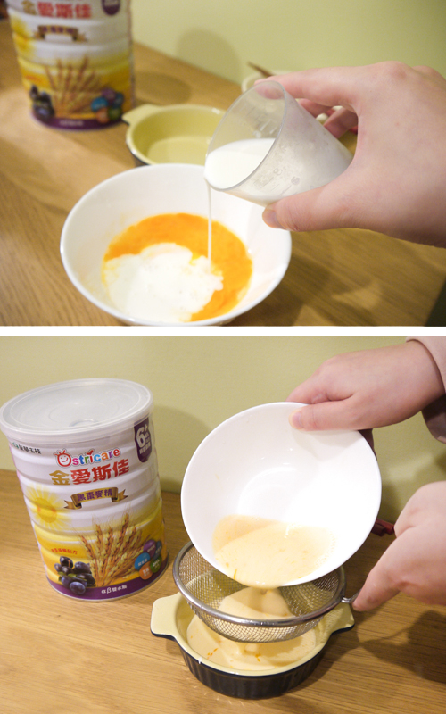把雞蛋打在碗裡並加入50cc的牛奶,因為是寶寶吃的所以加入一點點鹽巴提味就好,倒入篩網過篩可以讓口感更細膩。(也可以省略這步驟)
