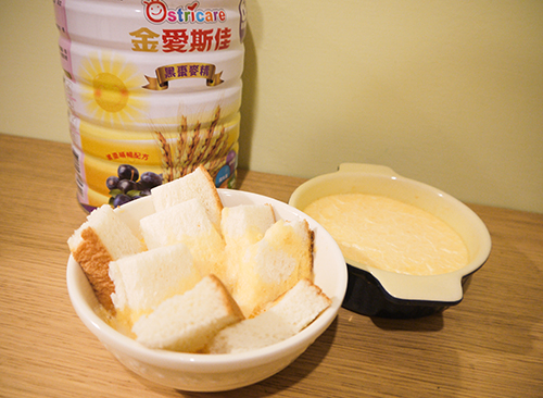 加入一點金愛斯佳黑棗麥精攪拌後就可以到入土司塊中了