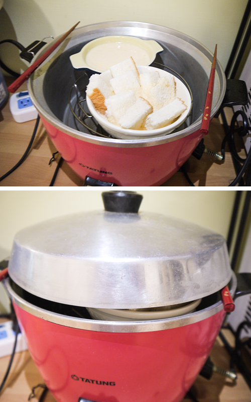 最後都放進電鍋一起蒸,電鍋左右放上筷子,不要整個蓋住,讓熱蒸氣可以外流,太過沸騰會讓蒸蛋都是洞洞。