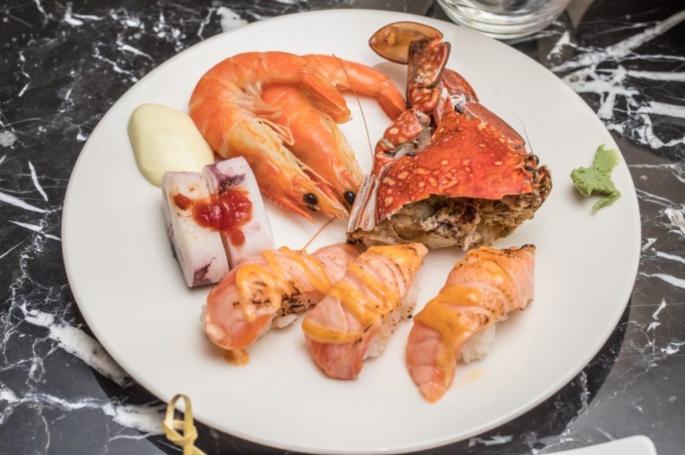 首先,就是美國杉河農場的濕式熟成45天肋眼牛排搭配有台式醬料加身的帶骨牛小排,以入口嚼感來說,包括選材與火候都控制得相當合理,肉汁與肉質表現不俗,很難想像是在能無限制加點的自助餐裡能品嘗到的風味。