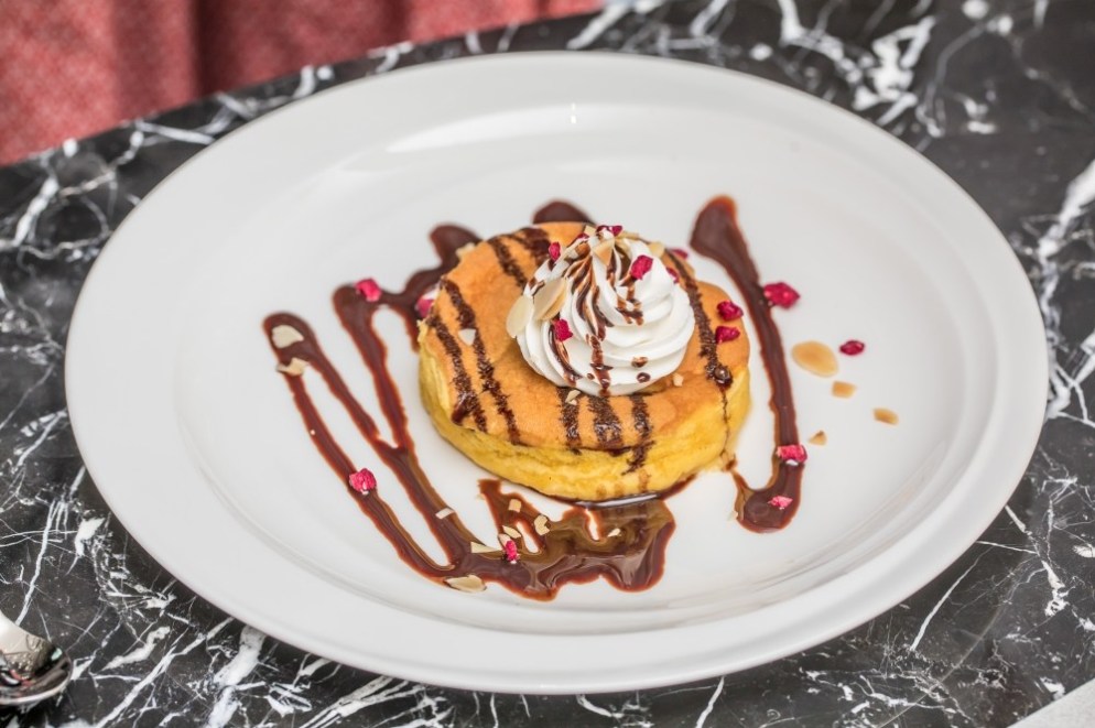 最後的壓軸,就是士林廚房的最大特色,也就是非常厲害的甜點區,首先出場的,就是蓬鬆綿密入口即化香草舒芙蕾鬆餅,再搭配濃郁又不膩口的的手打鮮奶油跟楓糖漿實在很迷人。