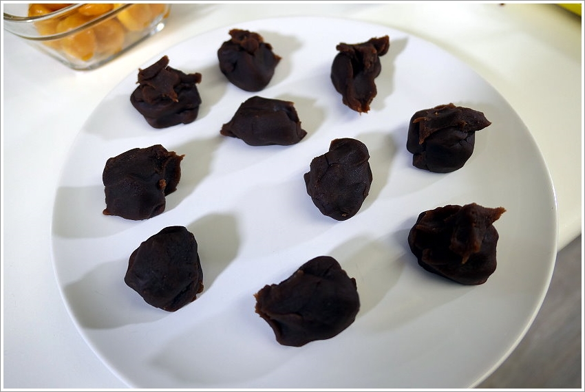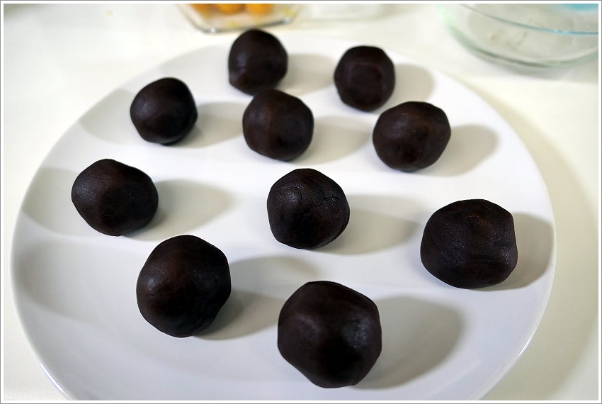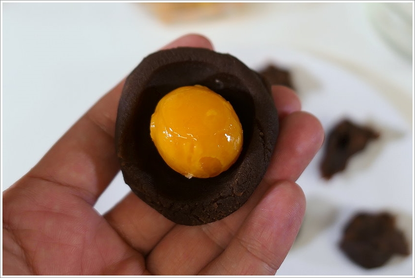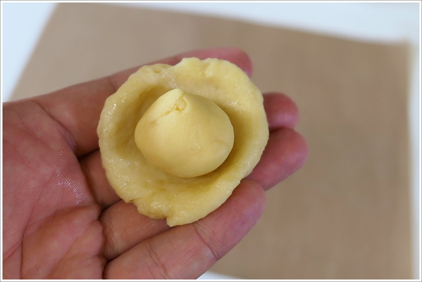 ▼就這樣,紅豆沙搓圓後把它壓平一點,將蛋黃包入。