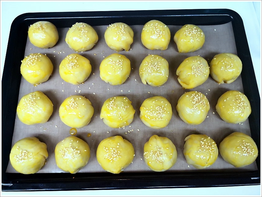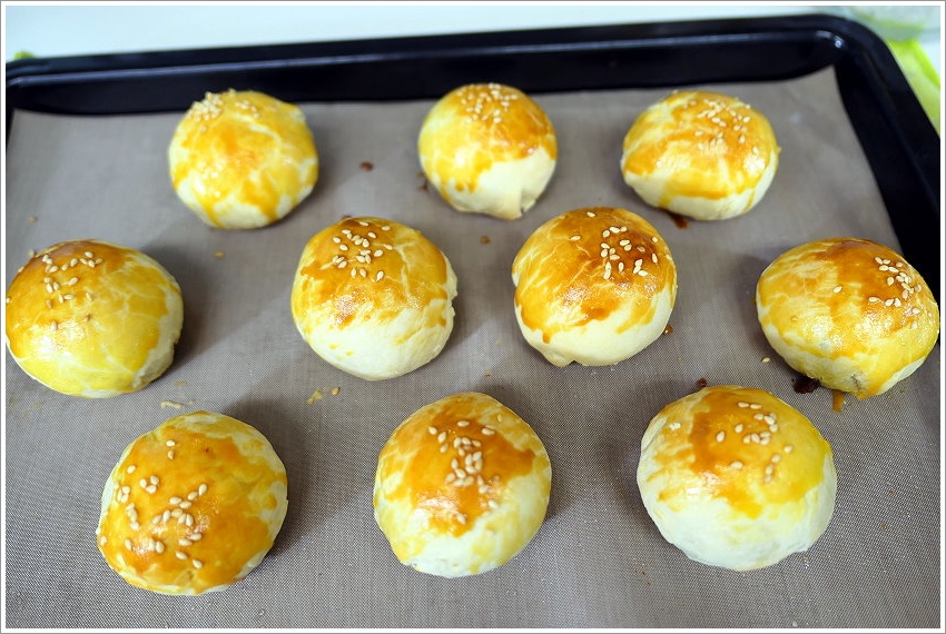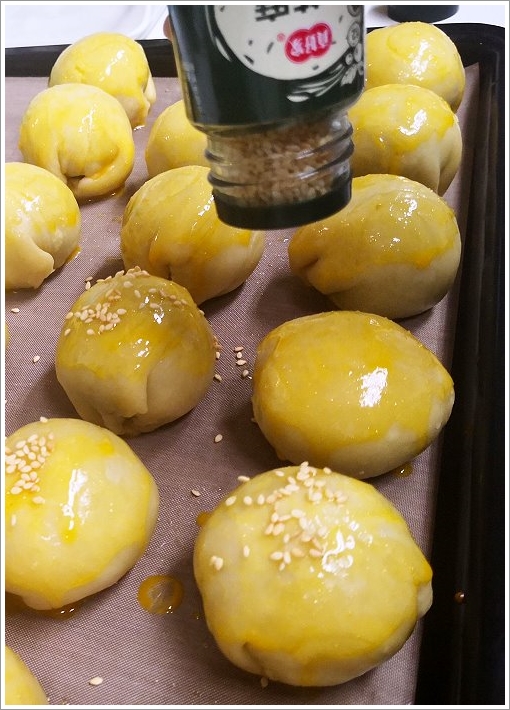 ▼最後塗上蛋液、撒上芝麻即可開始烘烤。 (蛋液如果想要講求美觀,可以先塗一層後等5分鐘稍微乾掉後再塗第二層,我依然偷懶只塗一次)