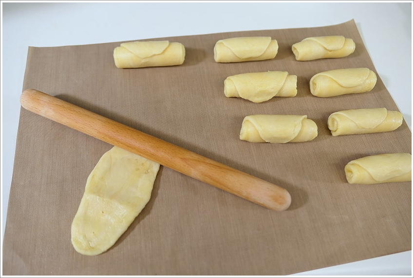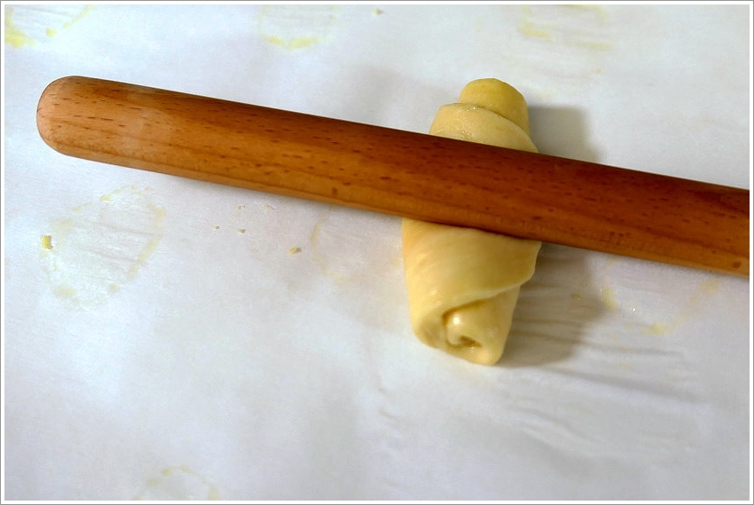 ▼將麵團壓扁後,擀成牛舌餅般的長條狀後捲起來