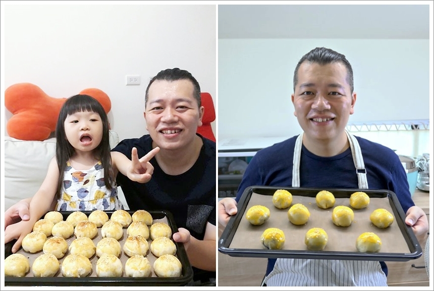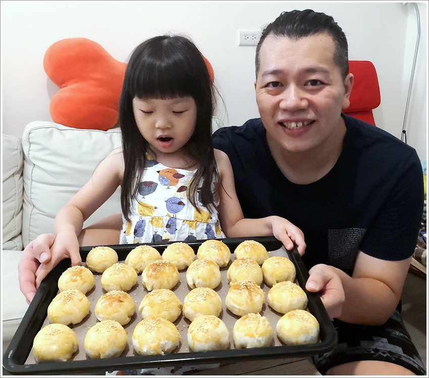 ▼我們家小可愛也是第一次看到蛋黃酥從烤箱拿出來,研究許久!
