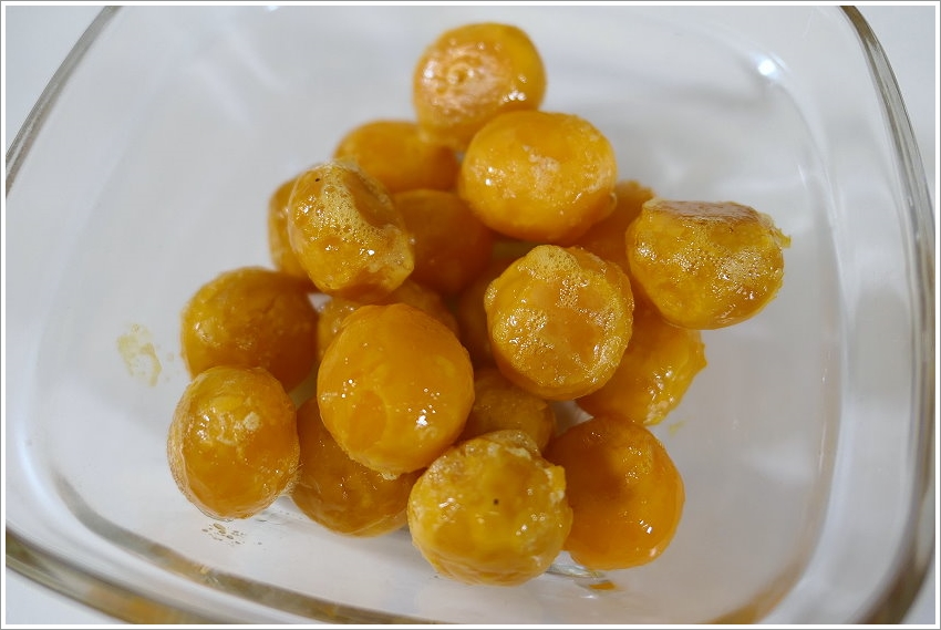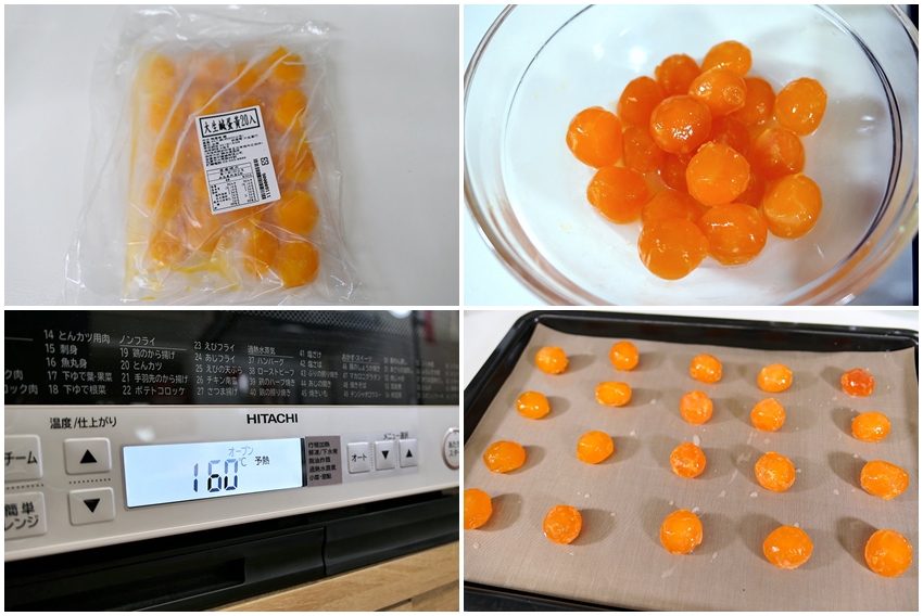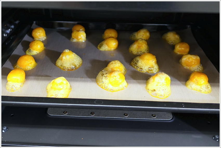 ▼蛋黃跟紅豆餡可以到食品材料行購買,大口是到桃園的全國食材廣場買的冷凍鹹蛋黃,品質還不錯!1包20入,買回來後可以直接倒點米酒讓每一顆都沾濕後,放到烤盤上,以150度烤8~10分鐘即可放涼備用。 (左下圖之前用160度也OK,其實沒差太多,不要烤太乾即可)