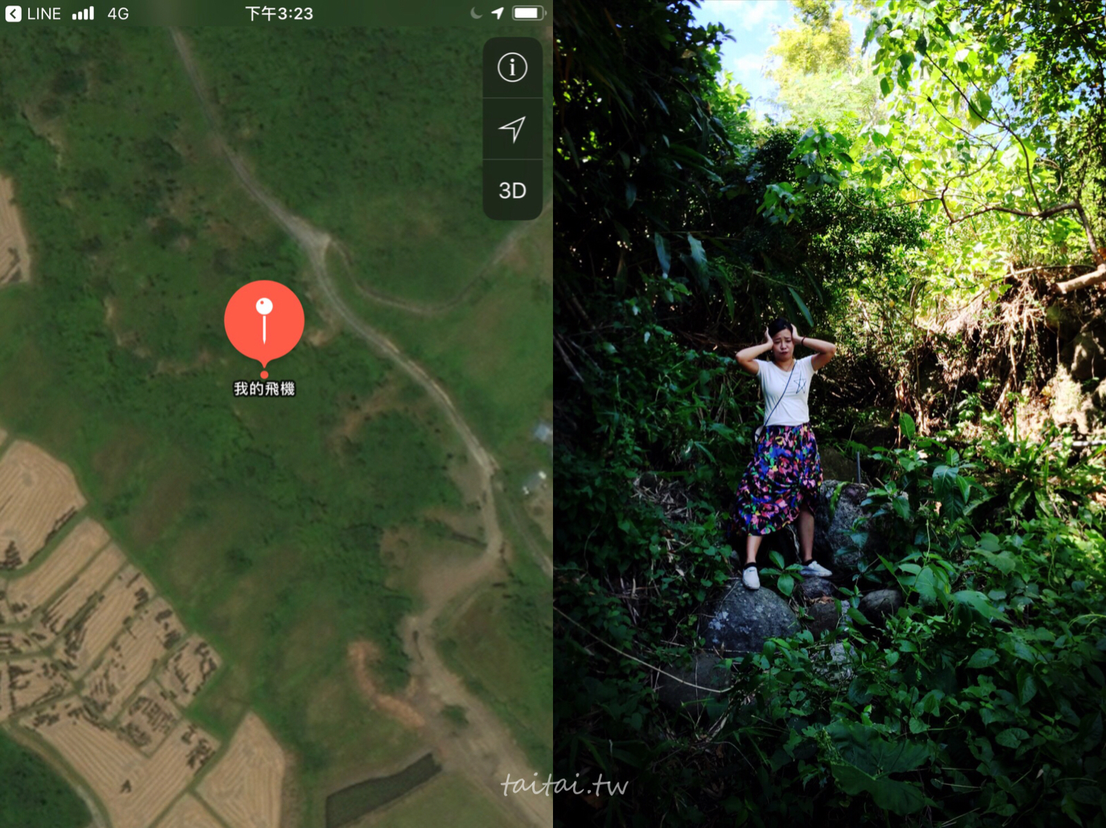 於是,悠閒的生日度假,變調成為小夫妻鑽進茂密竹林中的小溪河床向上攀爬,試著接近空拍機可能的墜落之處,最後搞得兩人身上傷痕累累無功而返。