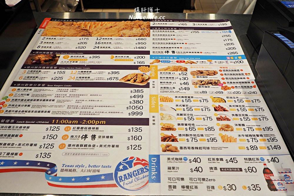 這裡的員工也很有默契,看到拍照自動頭轉向一邊,不過這不是重點,重點是若覺得太小字,一旁有menu可以拿,除了有炸雞套餐、烤雞餐,還有二人到全家的分享餐,但餐點這麼多怎麼點?當然就是跟著爆肝點阿!