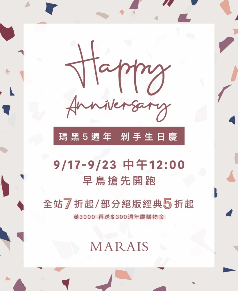 一年一度最大檔,瑪黑 5 週年「剁手生日慶」宣告正式登場!搶在週年慶浪潮最前面,瑪黑家居今年隆重挺入 5 歲,9/ 17 起端出各種比往年更厲害、超實際的優惠折扣,來自世界各地、全台獨家販售商品最低 7 折;部分絕版斷貨品低至 5 折!更在台北微風廣場特別開設期間限定瑪黑 Pop-up「剁手專門店」,開幕特別 5 天全店商品無條件現折 30% ,不分種類、不限數量通通限時超級優惠!