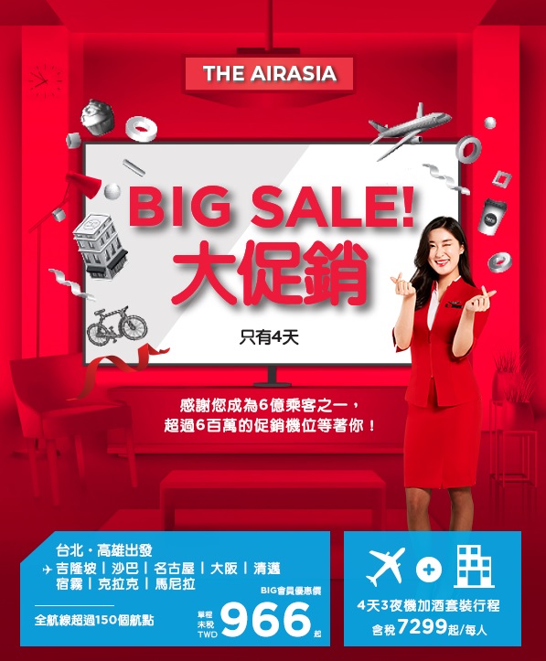 AirAsia 集團首席商務長 Karen Chan 表示,為了表達對我們的6億乘客的感激之情,我們很高興地宣佈在我們的秋季大促銷即將展開,隨著AirAsia即將轉型成為旅遊科技平台,從此次開始,AirAsia大促銷不僅僅是機票優惠,消費者在airasia.com搶購機票時,別忘了留意目的地之飯店、行程活動是否擁有折扣,以及是否有機加酒的優惠方案。