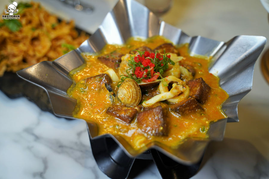 帶有海鮮甜味與蟹黃風味,油炸過的豆腐吸附滿滿海鮮煲湯汁