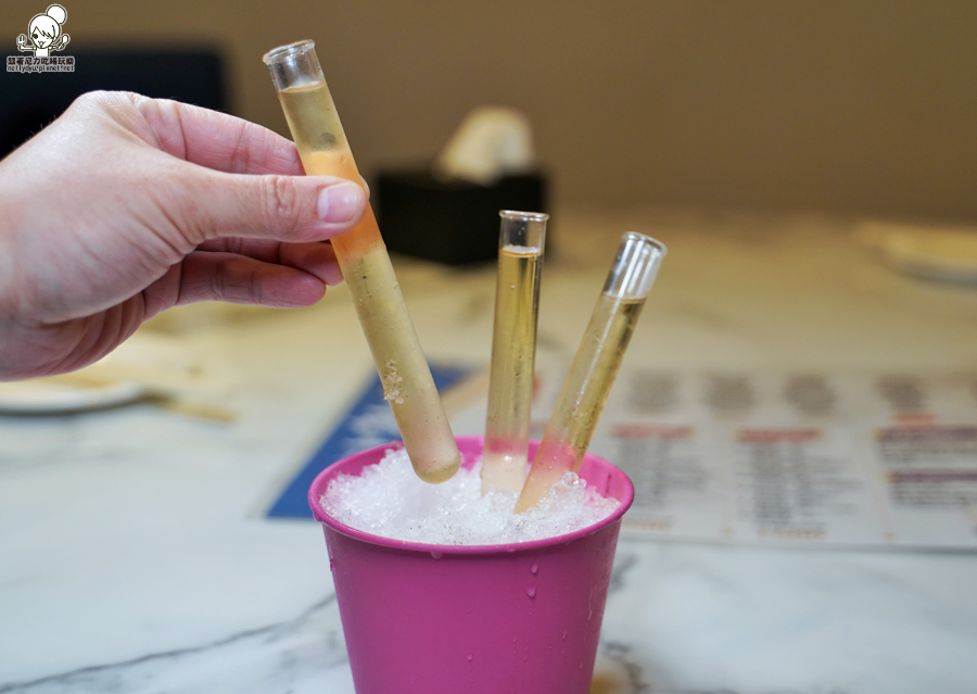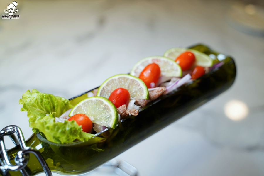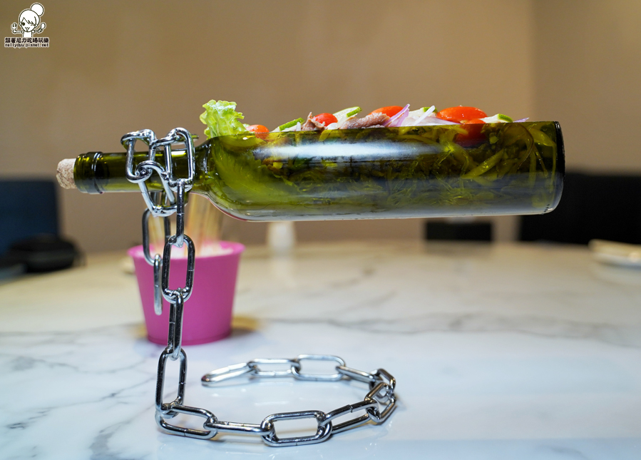 讓鐵鍊能立起酒瓶,放了主廚特製開胃的泰式雷夢牛
