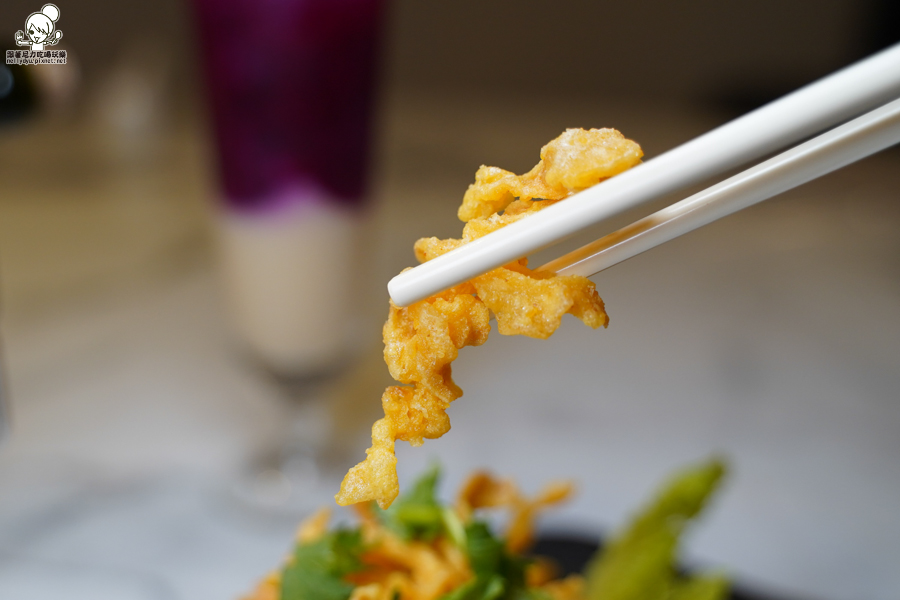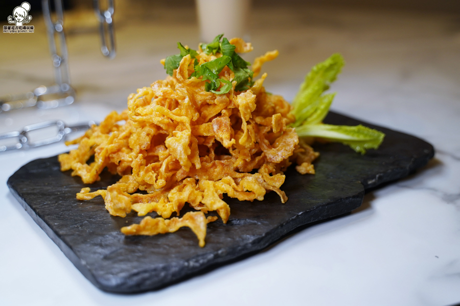 使用鹹鴨蛋蛋黃,包覆片狀的苦瓜,油炸到金黃酥脆像是餅乾脆度