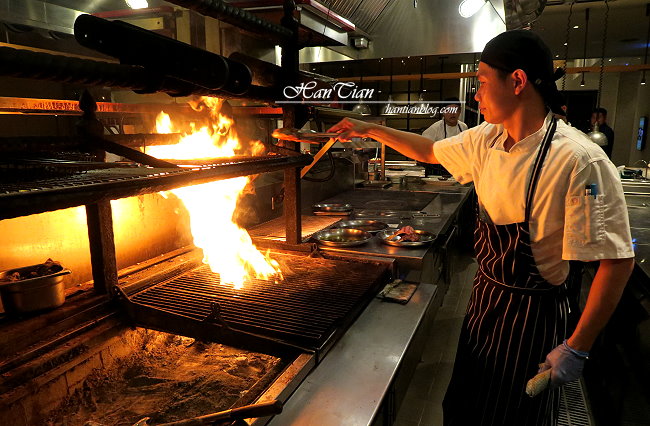 Que原木燒烤餐廳中間是開放式廚房,不管坐在餐廳內的哪一個位置都可以看見主廚處理食物。