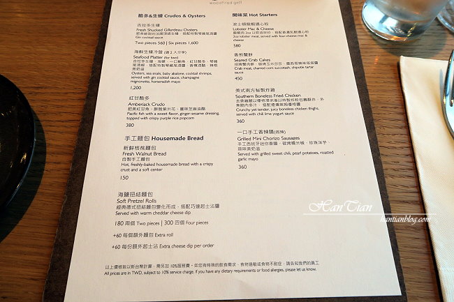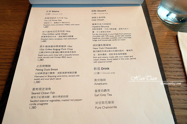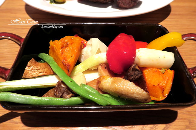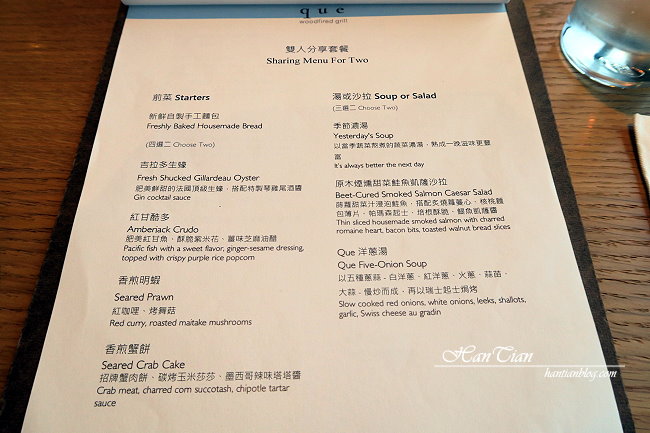 雙人分享套餐最推薦給愛吃牛肉的老饕,只有雙人分享套餐才有美國牛仔帶骨肋眼,服務人員特別推薦說,對愛吃牛肉的人來說絕對是推薦必點,這道帶骨肋眼經過原木燒烤,骨頭帶有原木的香氣,是別的地方吃不到的風味。