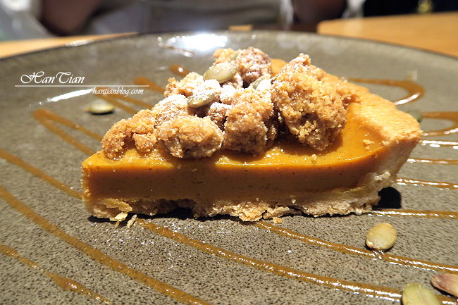 這天的精選主廚甜點是南瓜塔,南瓜香氣非常濃郁,底層的塔皮介於軟酥之間,不會太硬也不會太濕軟,搭配上南瓜餡,整體口感兩者相輔相成,互不相搶是一道看起來簡單,吃起來確不簡單的甜點