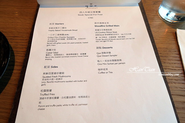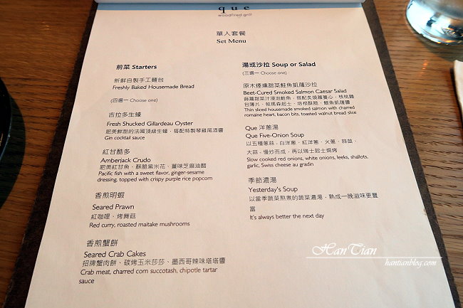 Que原木燒烤餐廳的餐點有四人分享套餐、雙人分享套餐、單人套餐,以及單點菜色,選擇相當多元,單人套餐的價格介於$1380~$1680,雙人套餐$2280 ~ $2980,更多菜單可以點這裡查詢。