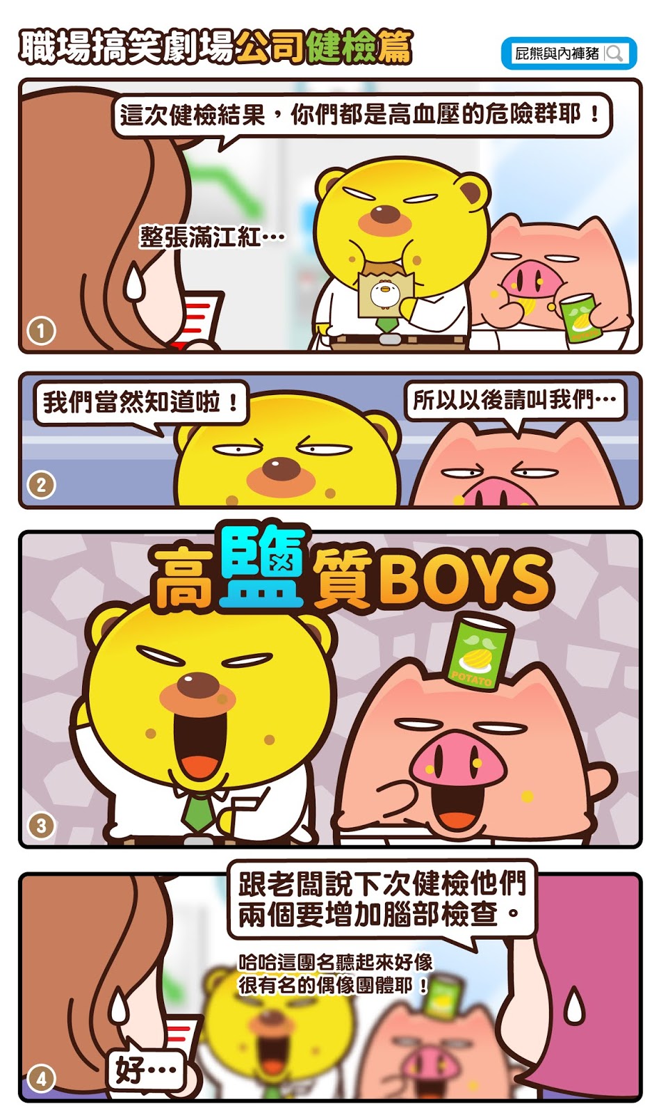 屁小熊 2019/09/26瀏覽: views 大家進公司後,公司都有安排一年一度的健康檢查嗎?來看看屁熊內褲豬這一次的檢查結果如何? 由此可見健康檢查的重要性啊(抖),是說屁熊工作到現在,公司都沒安排過健檢…不知道大家每年的健檢,身體是越來越好,還是越來越糟呢?不能當個高顏質,好歹也能當個高「鹽」質 更多的職場搞笑劇場不要錯過囉! Related Items圖文觀點好有趣屁熊內褲豬職場甘苦 圖文觀點 2019/09/26瀏覽: views 屁小熊 愛分享上班搞笑的屁熊還有內褲豬,職場不開心的話就快來找我們 ■作者:屁小熊 ■主題:職場、漫畫、生活、搞笑 ■個人網站:https://padbear68ee07.blogspot.com/ ■FB粉絲團:https://www.facebook.com/ppbear123 ■連絡方式:197968ee07@gmail.com Related Items圖文觀點好有趣屁熊內褲豬職場甘苦 next page