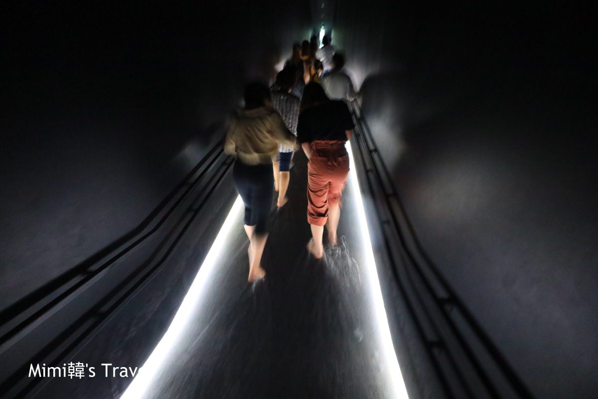 不過裡面一樣就很暗,再加上為了方便投影,水是白色的,大家一定要記得小心身上的手機或飾品別掉下去,基本上是看不到的,只能用摸的。